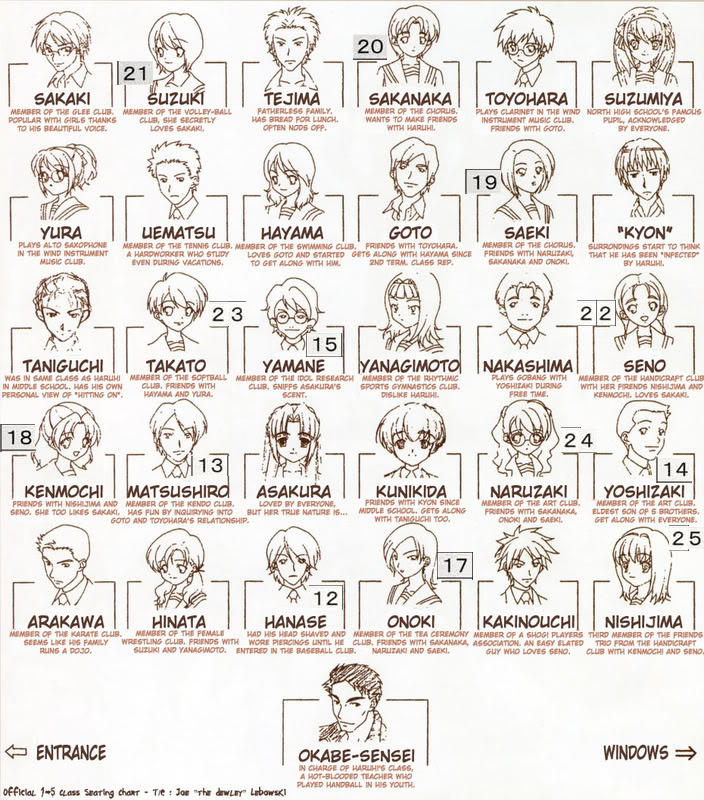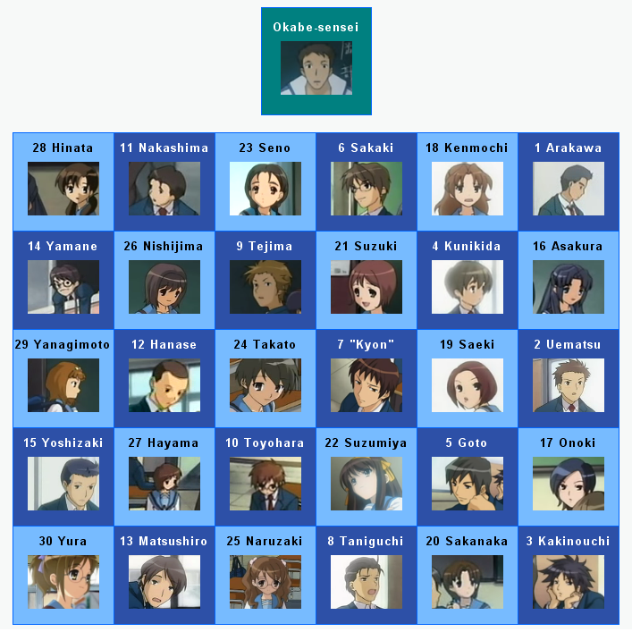 In year 1, Kyon, Haruhi, Kunikida and Taniguchi, among a few others in Class 1-5, graduated to Class 2-5, also taught by Okabe. T transfers into Class 2-5 later in the year.