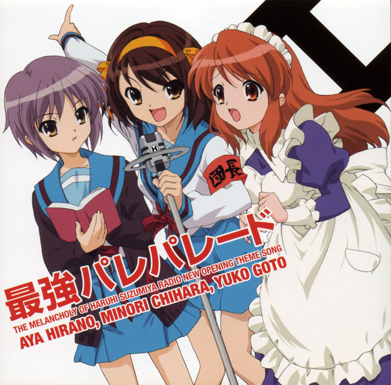 Saikyō Pare Parade (最強パレパレード, Saikyō Pare Parēdo, lit. "The Strongest Pare Parade") is the second single. The songs "Saikyō Pare Parade" and "Unmeiteki Jiken no Kōfuku" were the opening and ending themes respectively for the Haruhi Suzumiya radio dramas, first, second and third. The single was released on November 22, 2006 by Lantis. A cover version and music video was produced by Momoiro Clover in 2009.